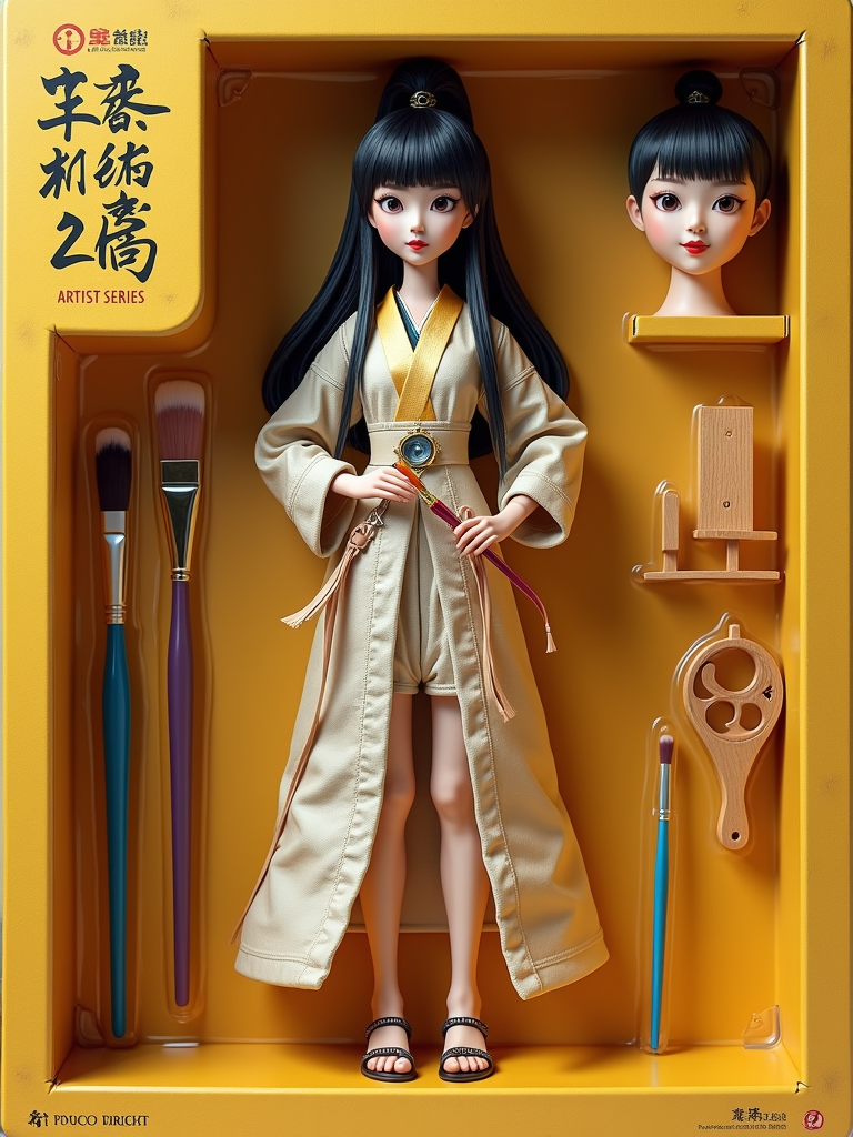 model as an action figure in packaging labeled 'ARTIST SERIES'. Use model as a reference for the face. Model is 6 inches tall and dressed in artistic attire, and holding a paintbrush. The cardboard section should be yellow. Include an 'Accessories' section with items like easel, paint palette, and art supplies. Make the design visually appealing and reflective of artistry. Do not include the character image on packaging.