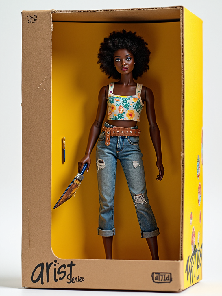 model as an action figure in packaging labeled 'ARTIST SERIES'. Use model as a reference for the face. Model is 6 inches tall and dressed in artistic attire, and holding a paintbrush. The cardboard section should be yellow. Include an 'Accessories' section with items like easel, paint palette, and art supplies. Make the design visually appealing and reflective of artistry. Do not include the character image on packaging.