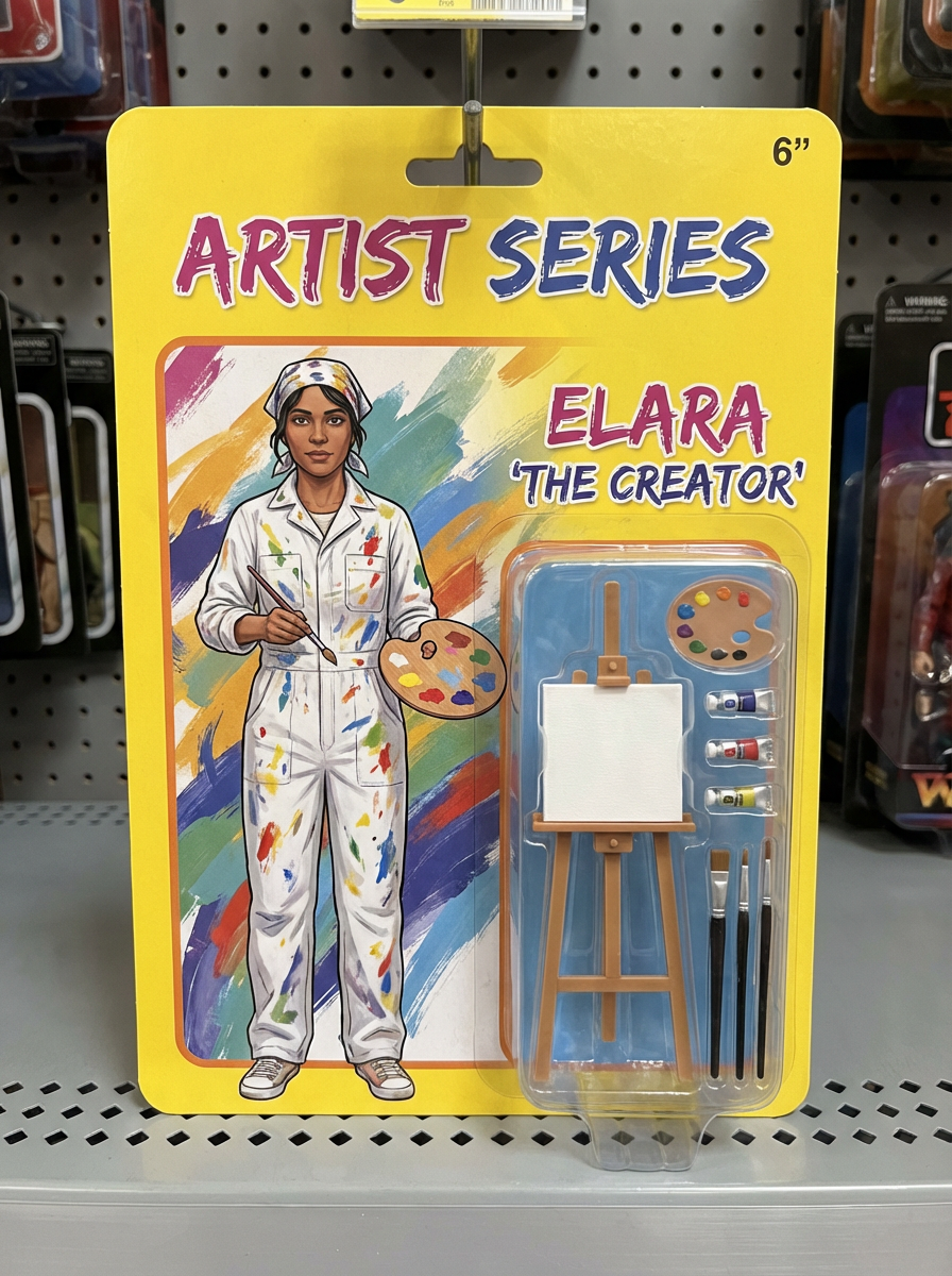 model as an action figure in packaging labeled 'ARTIST SERIES'. Use model as a reference for the face. Model is 6 inches tall and dressed in artistic attire, and holding a paintbrush. The cardboard section should be yellow. Include an 'Accessories' section with items like easel, paint palette, and art supplies. Make the design visually appealing and reflective of artistry. Do not include the character image on packaging.