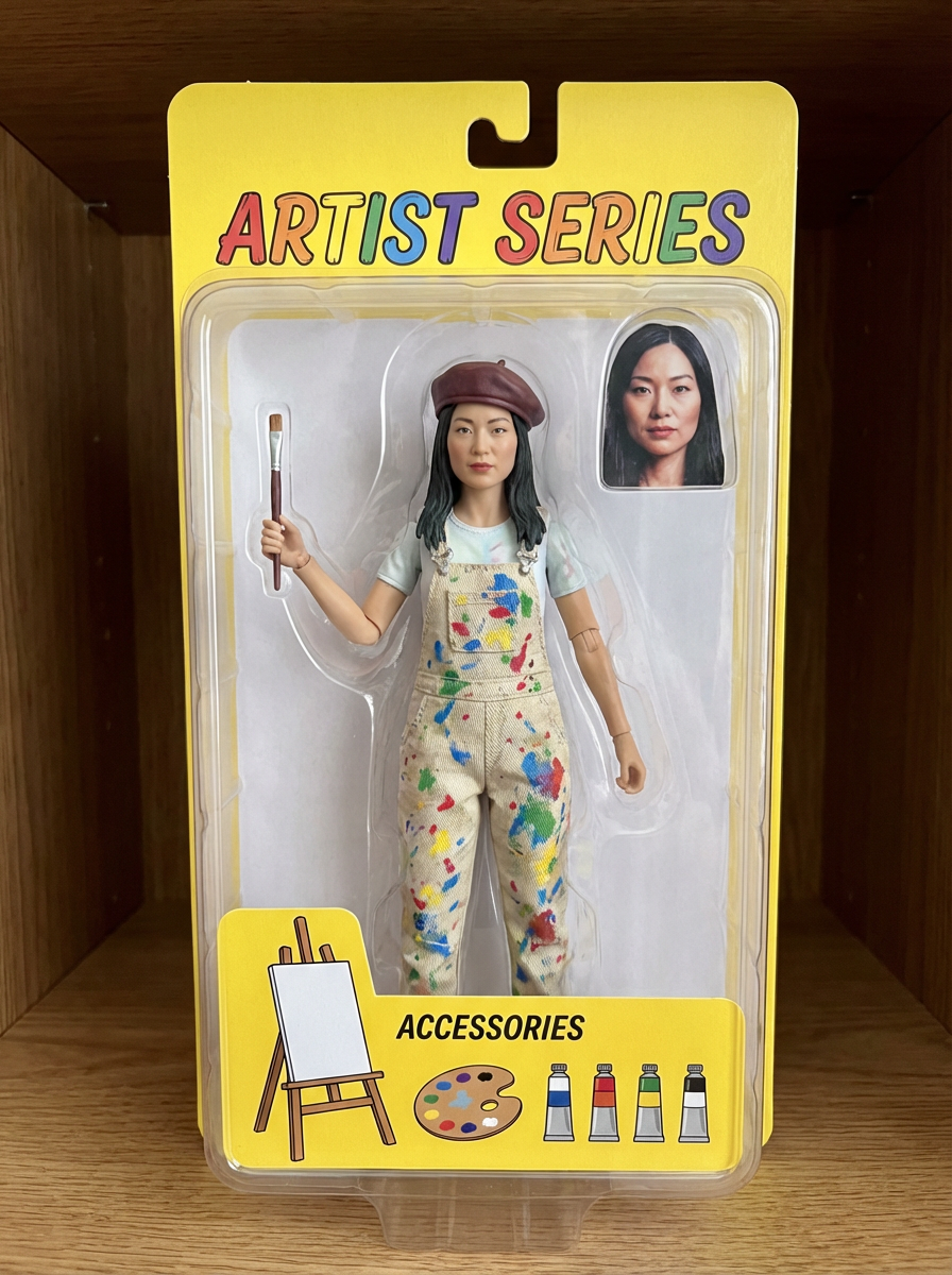 model as an action figure in packaging labeled 'ARTIST SERIES'. Use model as a reference for the face. Model is 6 inches tall and dressed in artistic attire, and holding a paintbrush. The cardboard section should be yellow. Include an 'Accessories' section with items like easel, paint palette, and art supplies. Make the design visually appealing and reflective of artistry. Do not include the character image on packaging.