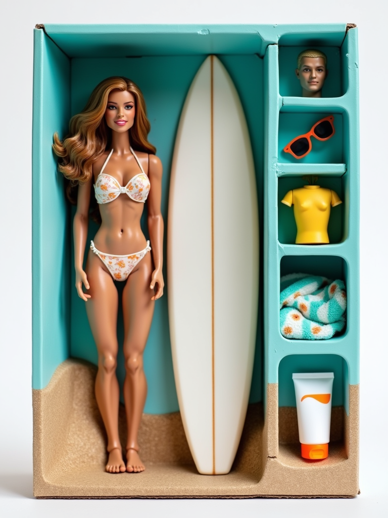 model as an action figure in packaging labeled 'BEACH SERIES'. Use model as a reference for the face. Model is 6 inches tall and dressed in swimwear, and holding a surfboard. The cardboard section should be teal. Include an 'Accessories' section with items like sunglasses, beach towel, and sunscreen. Make the design visually appealing and reflective of beach lifestyle. Do not include the character image on packaging.