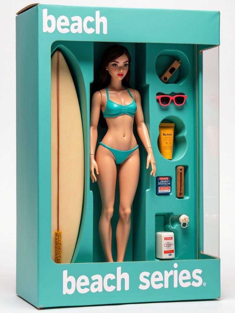 model as an action figure in packaging labeled 'BEACH SERIES'. Use model as a reference for the face. Model is 6 inches tall and dressed in swimwear, and holding a surfboard. The cardboard section should be teal. Include an 'Accessories' section with items like sunglasses, beach towel, and sunscreen. Make the design visually appealing and reflective of beach lifestyle. Do not include the character image on packaging.