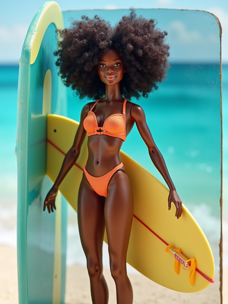 model as an action figure in packaging labeled 'BEACH SERIES'. Use model as a reference for the face. Model is 6 inches tall and dressed in swimwear, and holding a surfboard. The cardboard section should be teal. Include an 'Accessories' section with items like sunglasses, beach towel, and sunscreen. Make the design visually appealing and reflective of beach lifestyle. Do not include the character image on packaging.
