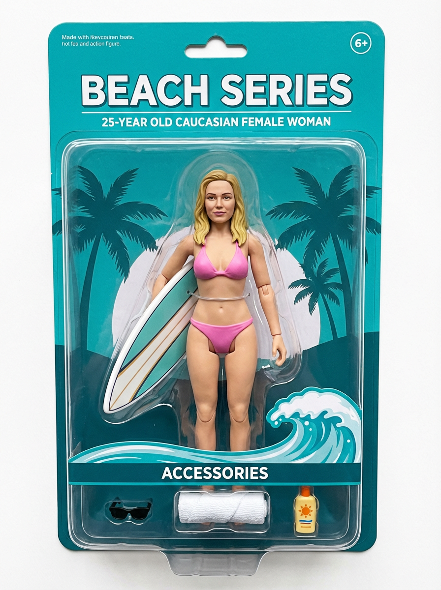 model as an action figure in packaging labeled 'BEACH SERIES'. Use model as a reference for the face. Model is 6 inches tall and dressed in swimwear, and holding a surfboard. The cardboard section should be teal. Include an 'Accessories' section with items like sunglasses, beach towel, and sunscreen. Make the design visually appealing and reflective of beach lifestyle. Do not include the character image on packaging.