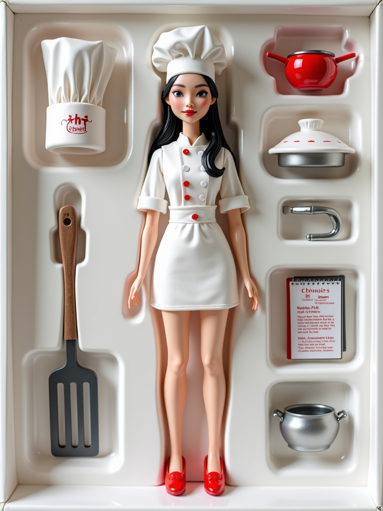 model as an action figure in packaging labeled 'CHEF COLLECTION'. Use model as a reference for the face. Model is 6 inches tall and dressed in chef uniform, and holding a spatula. The cardboard section should be white. Include an 'Accessories' section with items like chef hat, cooking pot, and recipe book. Make the design visually appealing and reflective of culinary arts. Do not include the character image on packaging.