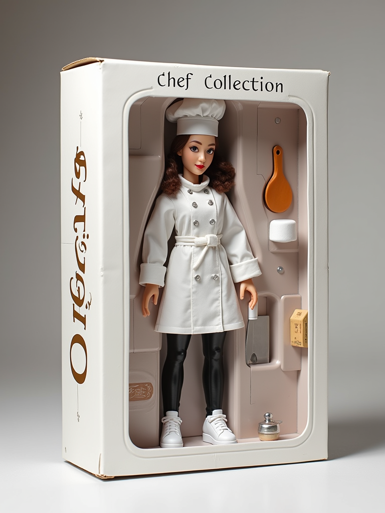 model as an action figure in packaging labeled 'CHEF COLLECTION'. Use model as a reference for the face. Model is 6 inches tall and dressed in chef uniform, and holding a spatula. The cardboard section should be white. Include an 'Accessories' section with items like chef hat, cooking pot, and recipe book. Make the design visually appealing and reflective of culinary arts. Do not include the character image on packaging.