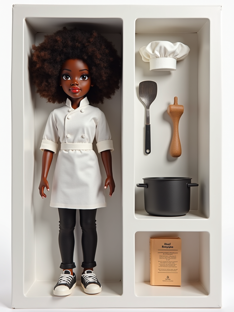 model as an action figure in packaging labeled 'CHEF COLLECTION'. Use model as a reference for the face. Model is 6 inches tall and dressed in chef uniform, and holding a spatula. The cardboard section should be white. Include an 'Accessories' section with items like chef hat, cooking pot, and recipe book. Make the design visually appealing and reflective of culinary arts. Do not include the character image on packaging.