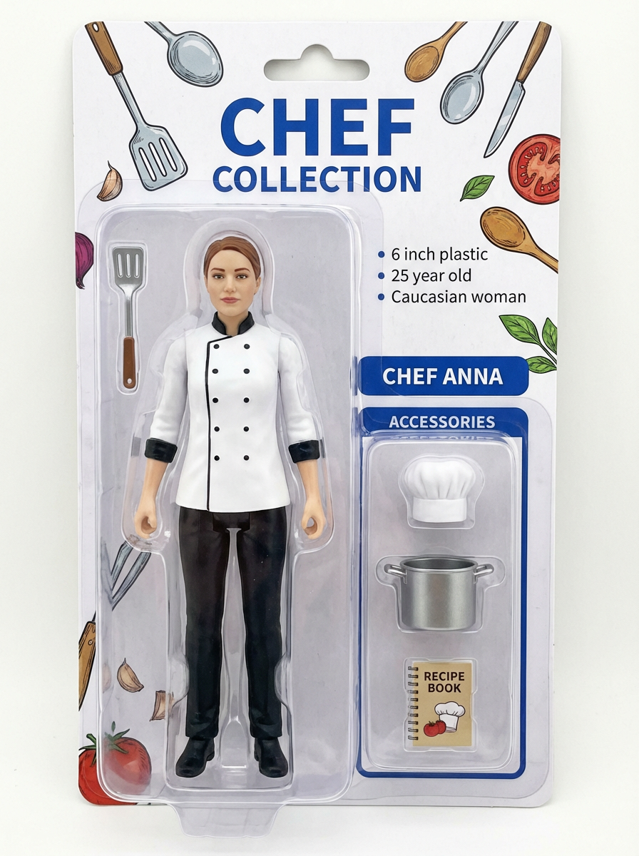 model as an action figure in packaging labeled 'CHEF COLLECTION'. Use model as a reference for the face. Model is 6 inches tall and dressed in chef uniform, and holding a spatula. The cardboard section should be white. Include an 'Accessories' section with items like chef hat, cooking pot, and recipe book. Make the design visually appealing and reflective of culinary arts. Do not include the character image on packaging.