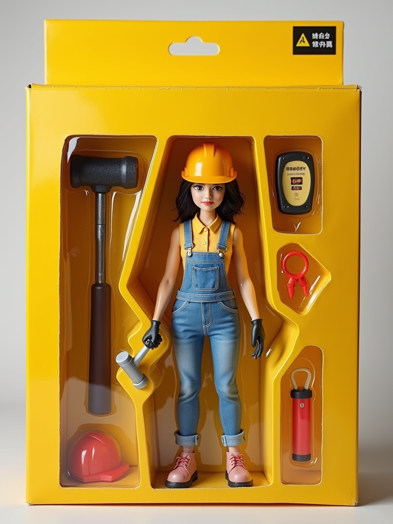 model as an action figure in packaging labeled 'CONSTRUCTION EDITION'. Use model as a reference for the face. Model is 6 inches tall and dressed in construction worker attire with hard hat, and holding a hammer. The cardboard section should be yellow. Include an 'Accessories' section with items like tool belt, safety goggles, and measuring tape. Make the design visually appealing and reflective of construction industry. Do not include the character image on packaging.