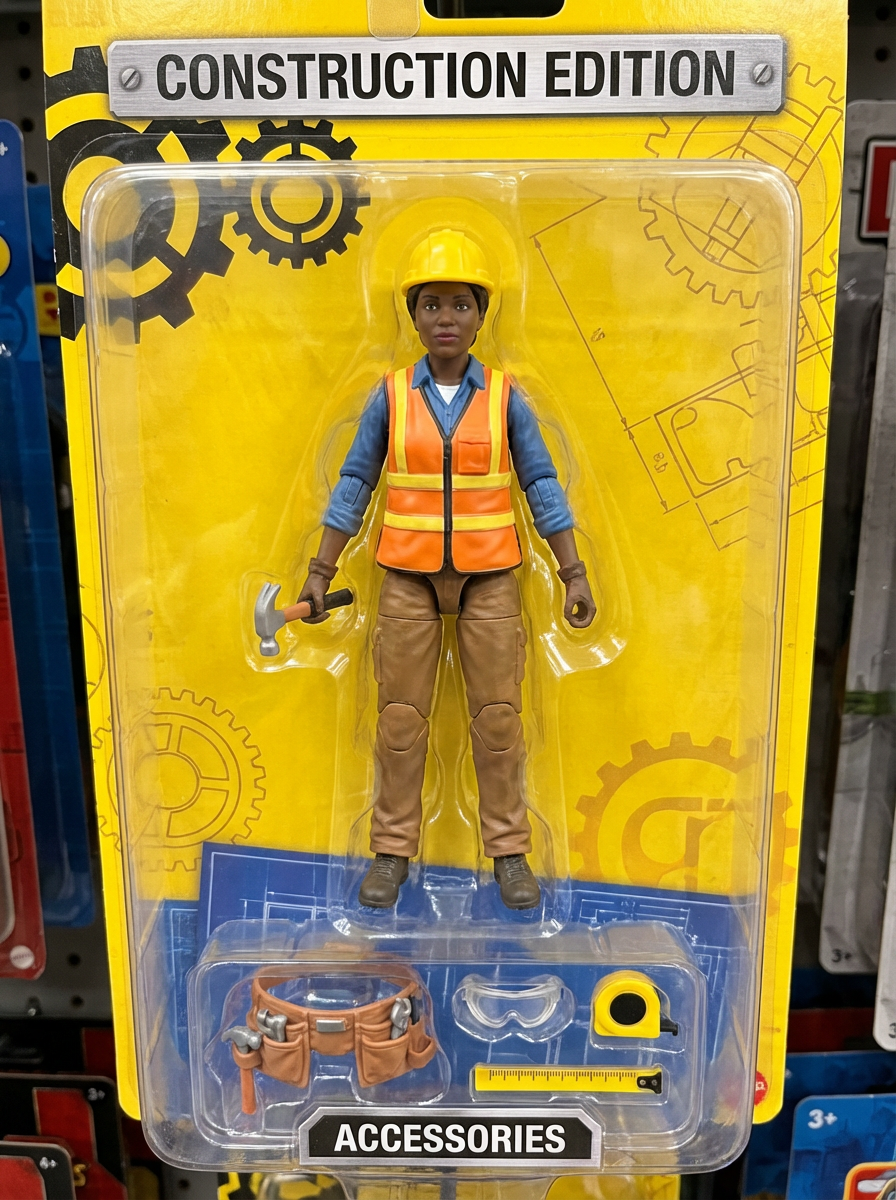model as an action figure in packaging labeled 'CONSTRUCTION EDITION'. Use model as a reference for the face. Model is 6 inches tall and dressed in construction worker attire with hard hat, and holding a hammer. The cardboard section should be yellow. Include an 'Accessories' section with items like tool belt, safety goggles, and measuring tape. Make the design visually appealing and reflective of construction industry. Do not include the character image on packaging.