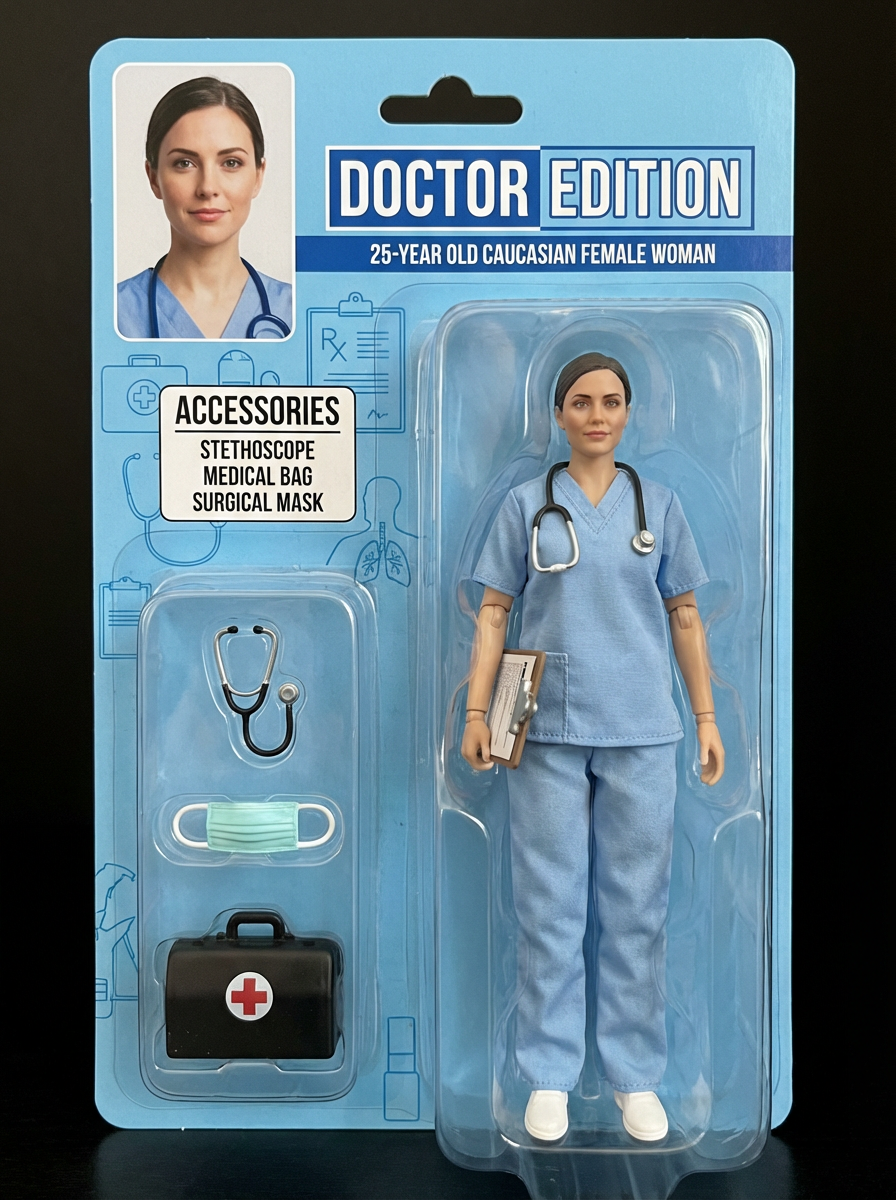 model as an action figure in packaging labeled 'DOCTOR EDITION'. Use model as a reference for the face. Model is 6 inches tall and dressed in medical scrubs with stethoscope, and holding a clipboard. The cardboard section should be light blue. Include an 'Accessories' section with items like stethoscope, medical bag, and surgical mask. Make the design visually appealing and reflective of healthcare profession. Do not include the character image on packaging.