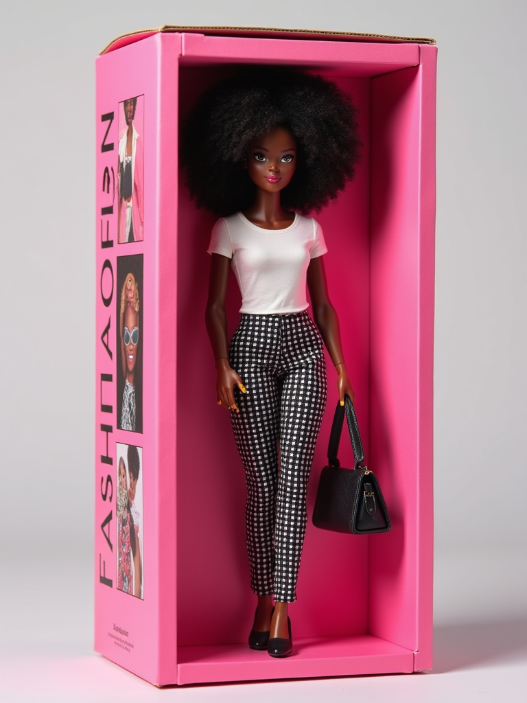 model as an action figure in packaging labeled 'FASHIONISTA'. Use model as a reference for the face. Model is 6 inches tall and dressed in fashionable attire, and holding a handbag. The cardboard section should be pink. Include an 'Accessories' section with items like sunglasses, handbag, and fashion magazine. Make the design visually appealing and reflective of fashion industry. Do not include the character image on packaging.