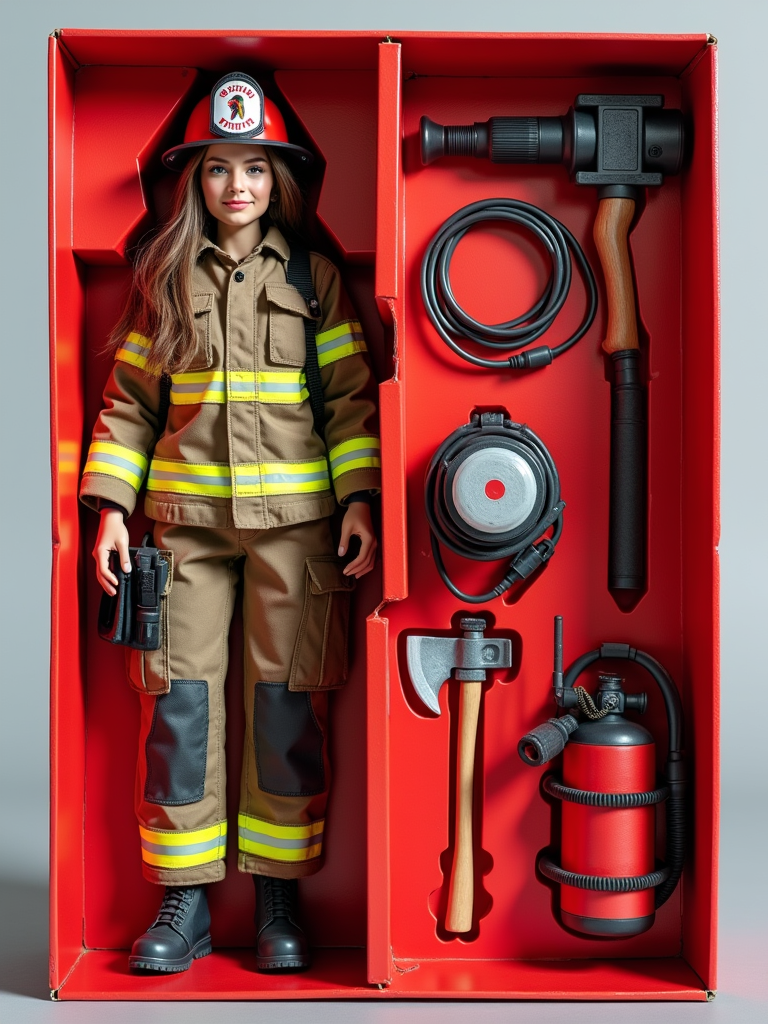 model as an action figure in packaging labeled 'FIREFIGHTER EDITION'. Use model as a reference for the face. Model is 6 inches tall and dressed in firefighter uniform with helmet, and holding an axe. The cardboard section should be red. Include an 'Accessories' section with items like fire hose, oxygen tank, and radio. Make the design visually appealing and reflective of firefighting profession. Do not include the character image on packaging.