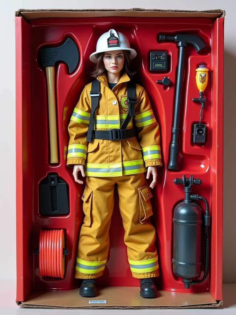 model as an action figure in packaging labeled 'FIREFIGHTER EDITION'. Use model as a reference for the face. Model is 6 inches tall and dressed in firefighter uniform with helmet, and holding an axe. The cardboard section should be red. Include an 'Accessories' section with items like fire hose, oxygen tank, and radio. Make the design visually appealing and reflective of firefighting profession. Do not include the character image on packaging.