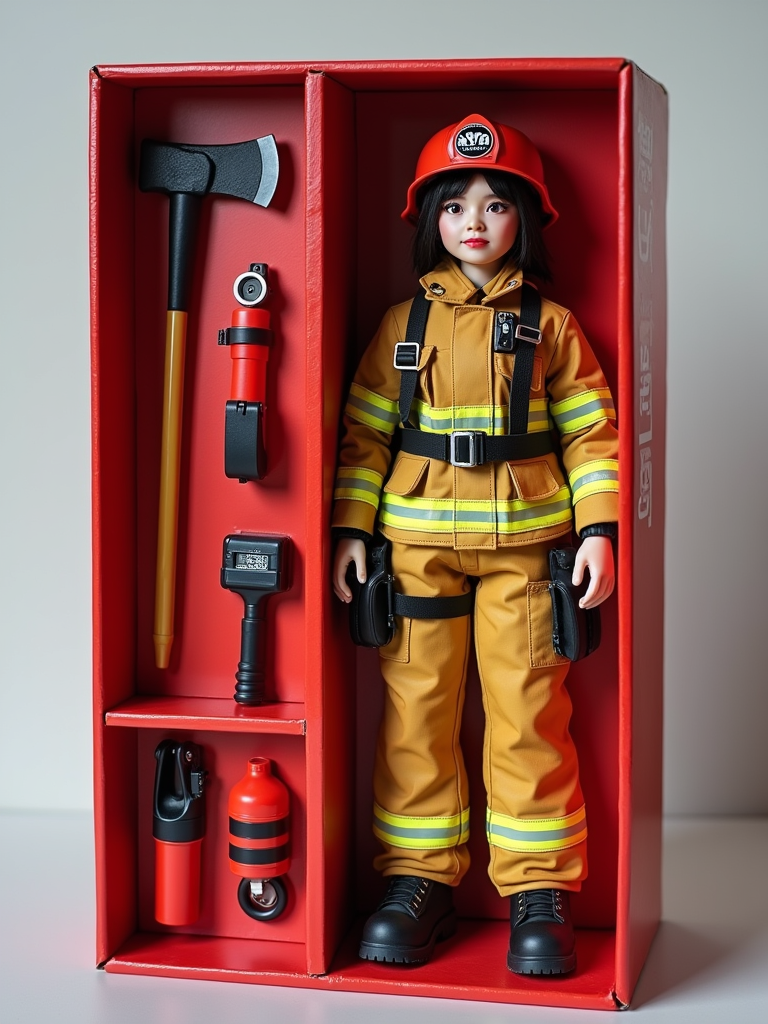 model as an action figure in packaging labeled 'FIREFIGHTER EDITION'. Use model as a reference for the face. Model is 6 inches tall and dressed in firefighter uniform with helmet, and holding an axe. The cardboard section should be red. Include an 'Accessories' section with items like fire hose, oxygen tank, and radio. Make the design visually appealing and reflective of firefighting profession. Do not include the character image on packaging.