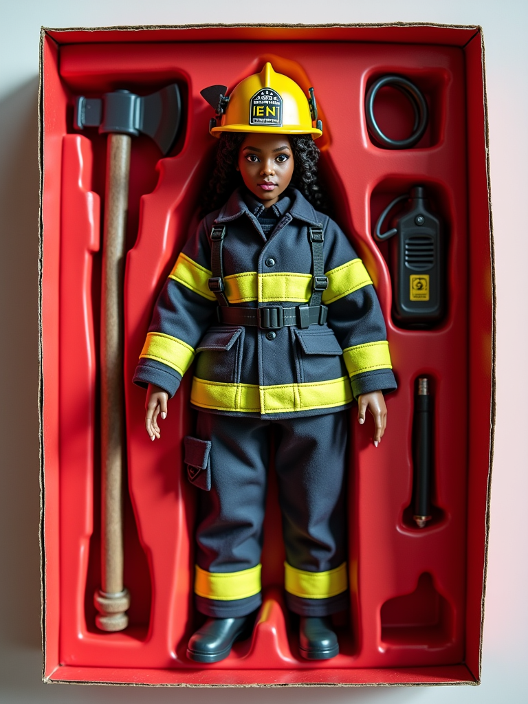 model as an action figure in packaging labeled 'FIREFIGHTER EDITION'. Use model as a reference for the face. Model is 6 inches tall and dressed in firefighter uniform with helmet, and holding an axe. The cardboard section should be red. Include an 'Accessories' section with items like fire hose, oxygen tank, and radio. Make the design visually appealing and reflective of firefighting profession. Do not include the character image on packaging.