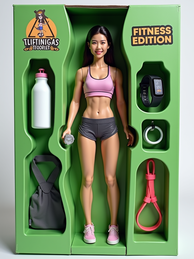 model as an action figure in packaging labeled 'FITNESS EDITION'. Use model as a reference for the face. Model is 6 inches tall and dressed in athletic wear, and holding a dumbbell. The cardboard section should be green. Include an 'Accessories' section with items like water bottle, fitness tracker, and resistance bands. Make the design visually appealing and reflective of fitness industry. Do not include the character image on packaging.
