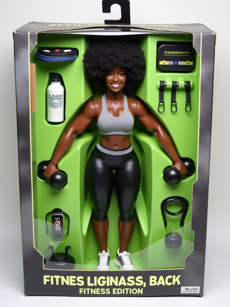 model as an action figure in packaging labeled 'FITNESS EDITION'. Use model as a reference for the face. Model is 6 inches tall and dressed in athletic wear, and holding a dumbbell. The cardboard section should be green. Include an 'Accessories' section with items like water bottle, fitness tracker, and resistance bands. Make the design visually appealing and reflective of fitness industry. Do not include the character image on packaging.
