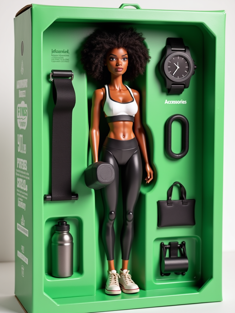 model as an action figure in packaging labeled 'FITNESS EDITION'. Use model as a reference for the face. Model is 6 inches tall and dressed in athletic wear, and holding a dumbbell. The cardboard section should be green. Include an 'Accessories' section with items like water bottle, fitness tracker, and resistance bands. Make the design visually appealing and reflective of fitness industry. Do not include the character image on packaging.