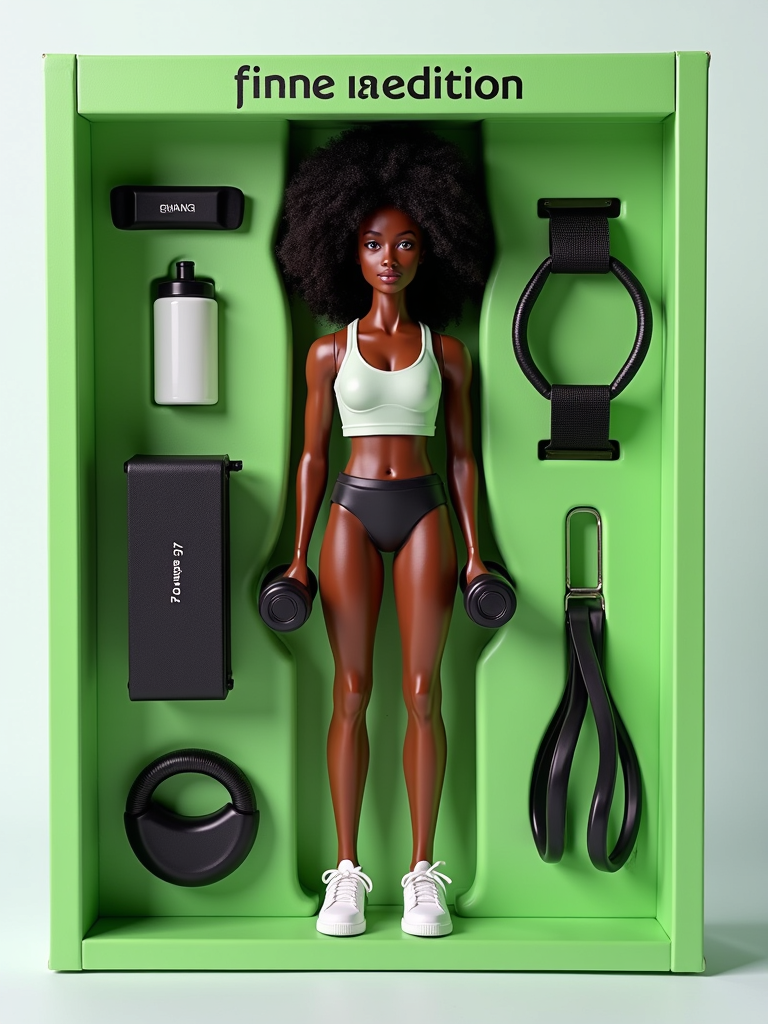 model as an action figure in packaging labeled 'FITNESS EDITION'. Use model as a reference for the face. Model is 6 inches tall and dressed in athletic wear, and holding a dumbbell. The cardboard section should be green. Include an 'Accessories' section with items like water bottle, fitness tracker, and resistance bands. Make the design visually appealing and reflective of fitness industry. Do not include the character image on packaging.