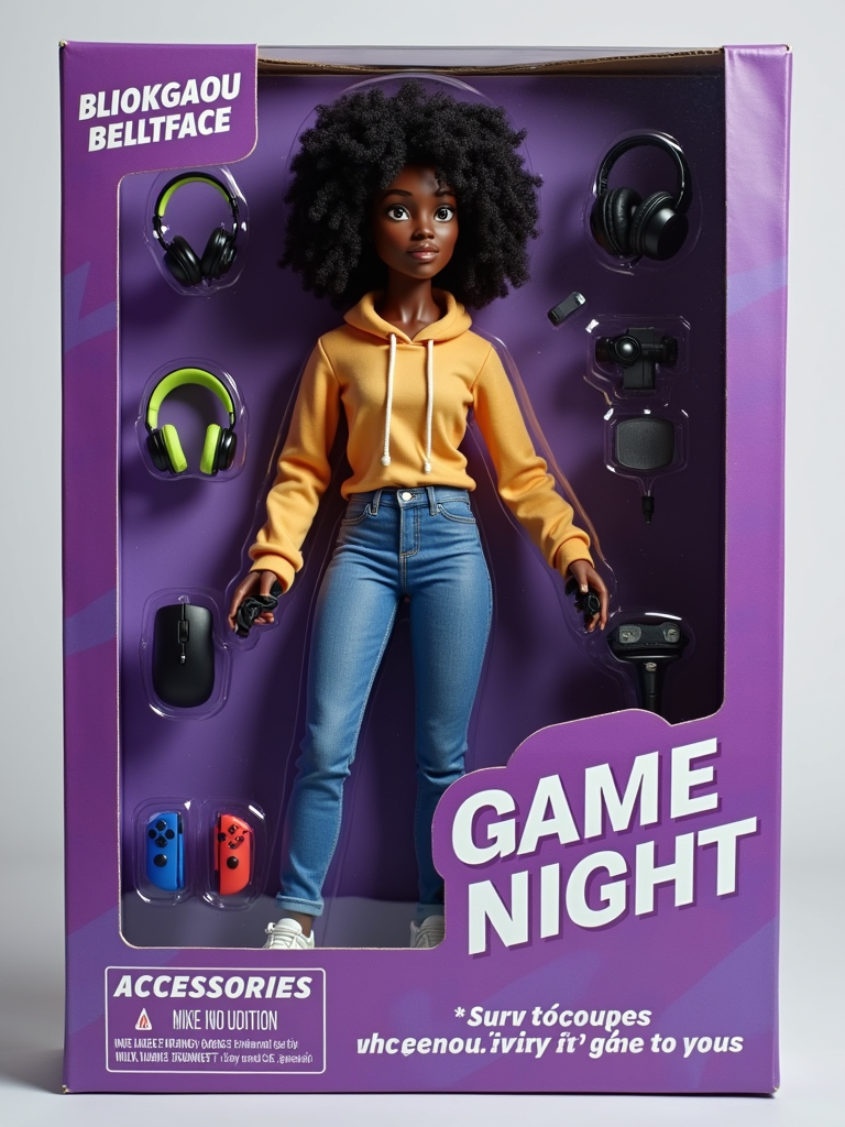 model as an action figure in packaging labeled 'GAME NIGHT'. Use model as a reference for the face. Model is 6 inches tall and dressed in casual gaming attire, and holding a controller. The cardboard section should be purple. Include an 'Accessories' section with items like gaming mouse, gaming headset, and gaming console. Make the design visually appealing and reflective of gaming culture. Do not include the character image on packaging.