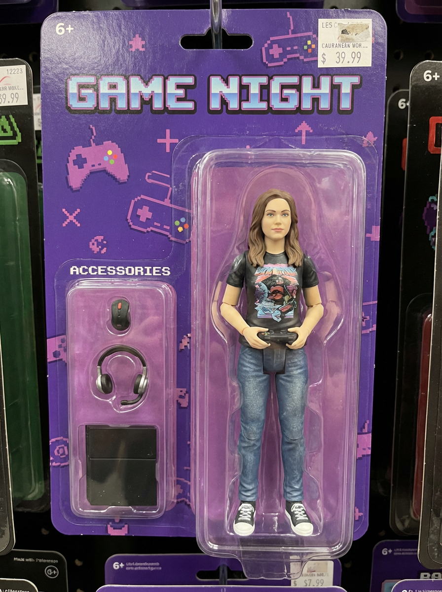 model as an action figure in packaging labeled 'GAME NIGHT'. Use model as a reference for the face. Model is 6 inches tall and dressed in casual gaming attire, and holding a controller. The cardboard section should be purple. Include an 'Accessories' section with items like gaming mouse, gaming headset, and gaming console. Make the design visually appealing and reflective of gaming culture. Do not include the character image on packaging.