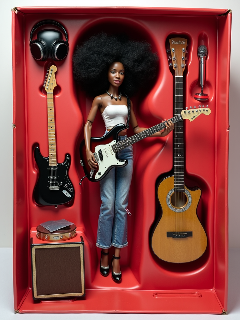 model as an action figure in packaging labeled 'MUSICIAN SERIES'. Use model as a reference for the face. Model is 6 inches tall and dressed in musical attire, and holding a guitar. The cardboard section should be red. Include an 'Accessories' section with items like microphone, music sheet, and headphones. Make the design visually appealing and reflective of music industry. Do not include the character image on packaging.