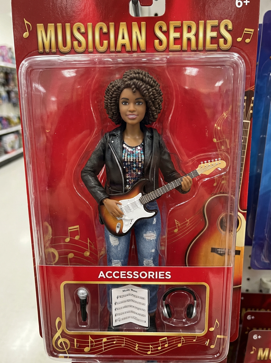 model as an action figure in packaging labeled 'MUSICIAN SERIES'. Use model as a reference for the face. Model is 6 inches tall and dressed in musical attire, and holding a guitar. The cardboard section should be red. Include an 'Accessories' section with items like microphone, music sheet, and headphones. Make the design visually appealing and reflective of music industry. Do not include the character image on packaging.