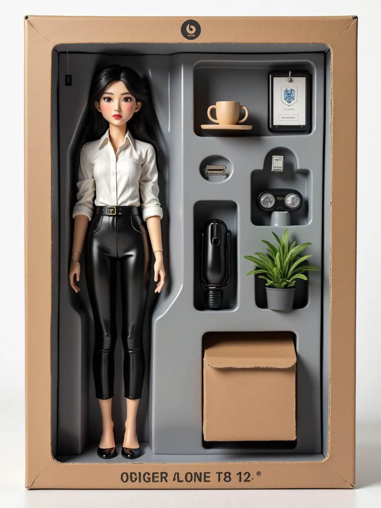 model as an action figure in packaging labeled 'OFFICE HERO'. Use model as a reference for the face. Model is 6.5 inches tall and dressed in office attire, and holding a coffee mug. The cardboard section should be gray. Include an 'Accessories' section with items like stapler, desk plant, and ID badge. Make the design visually appealing and reflective of office environment. Do not include the character image on packaging.