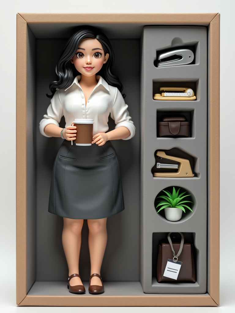 model as an action figure in packaging labeled 'OFFICE HERO'. Use model as a reference for the face. Model is 6.5 inches tall and dressed in office attire, and holding a coffee mug. The cardboard section should be gray. Include an 'Accessories' section with items like stapler, desk plant, and ID badge. Make the design visually appealing and reflective of office environment. Do not include the character image on packaging.