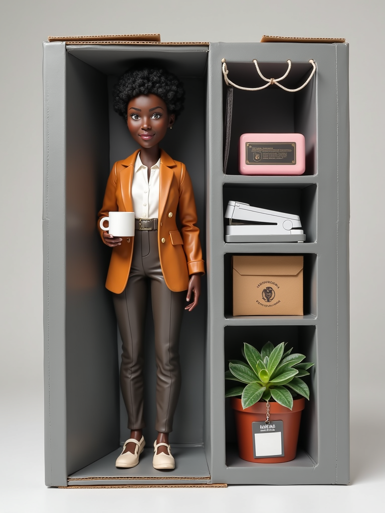 model as an action figure in packaging labeled 'OFFICE HERO'. Use model as a reference for the face. Model is 6.5 inches tall and dressed in office attire, and holding a coffee mug. The cardboard section should be gray. Include an 'Accessories' section with items like stapler, desk plant, and ID badge. Make the design visually appealing and reflective of office environment. Do not include the character image on packaging.