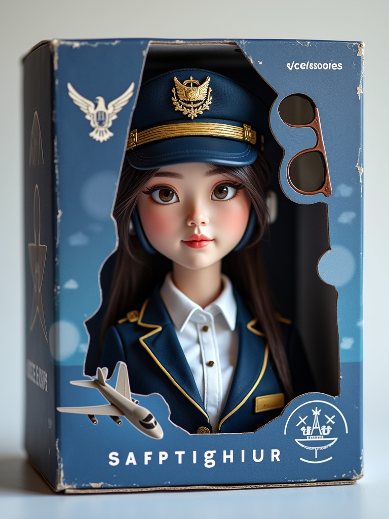 model as an action figure in packaging labeled 'PILOT EDITION'. Use model as a reference for the face. Model is 6 inches tall and dressed in pilot uniform with cap, and holding aviator sunglasses. The cardboard section should be navy blue. Include an 'Accessories' section with items like pilot headset, flight manual, and model airplane. Make the design visually appealing and reflective of aviation profession. Do not include the character image on packaging.