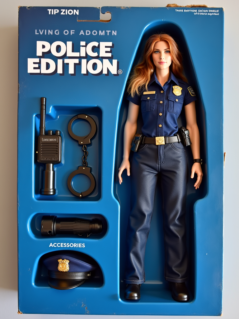 model as an action figure in packaging labeled 'POLICE EDITION'. Use model as a reference for the face. Model is 6 inches tall and dressed in police uniform with badge, and holding a walkie-talkie. The cardboard section should be blue. Include an 'Accessories' section with items like handcuffs, police hat, and flashlight. Make the design visually appealing and reflective of law enforcement profession. Do not include the character image on packaging.