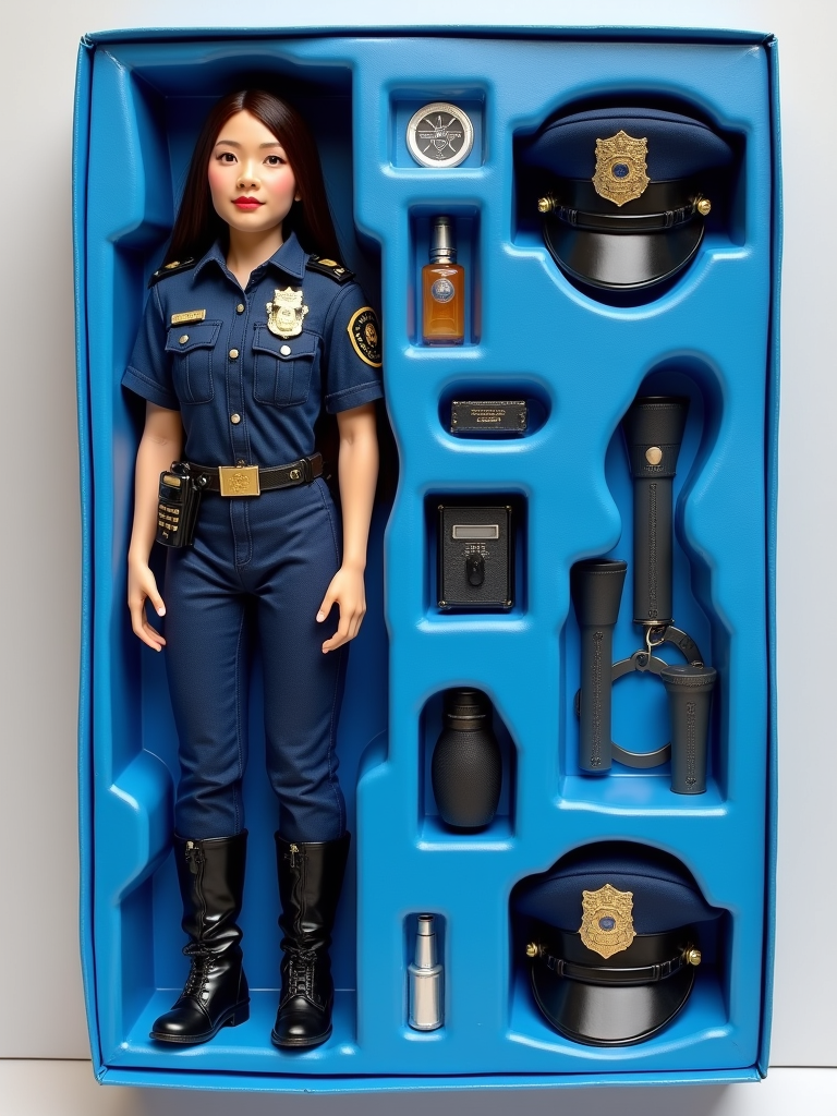 model as an action figure in packaging labeled 'POLICE EDITION'. Use model as a reference for the face. Model is 6 inches tall and dressed in police uniform with badge, and holding a walkie-talkie. The cardboard section should be blue. Include an 'Accessories' section with items like handcuffs, police hat, and flashlight. Make the design visually appealing and reflective of law enforcement profession. Do not include the character image on packaging.