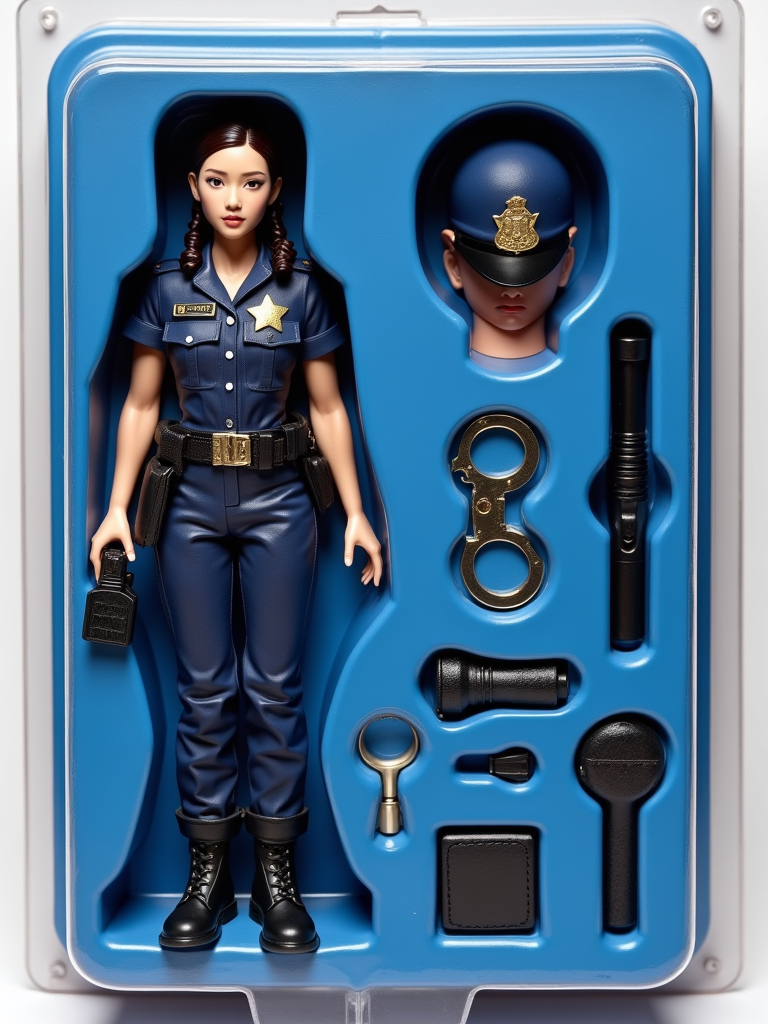 model as an action figure in packaging labeled 'POLICE EDITION'. Use model as a reference for the face. Model is 6 inches tall and dressed in police uniform with badge, and holding a walkie-talkie. The cardboard section should be blue. Include an 'Accessories' section with items like handcuffs, police hat, and flashlight. Make the design visually appealing and reflective of law enforcement profession. Do not include the character image on packaging.