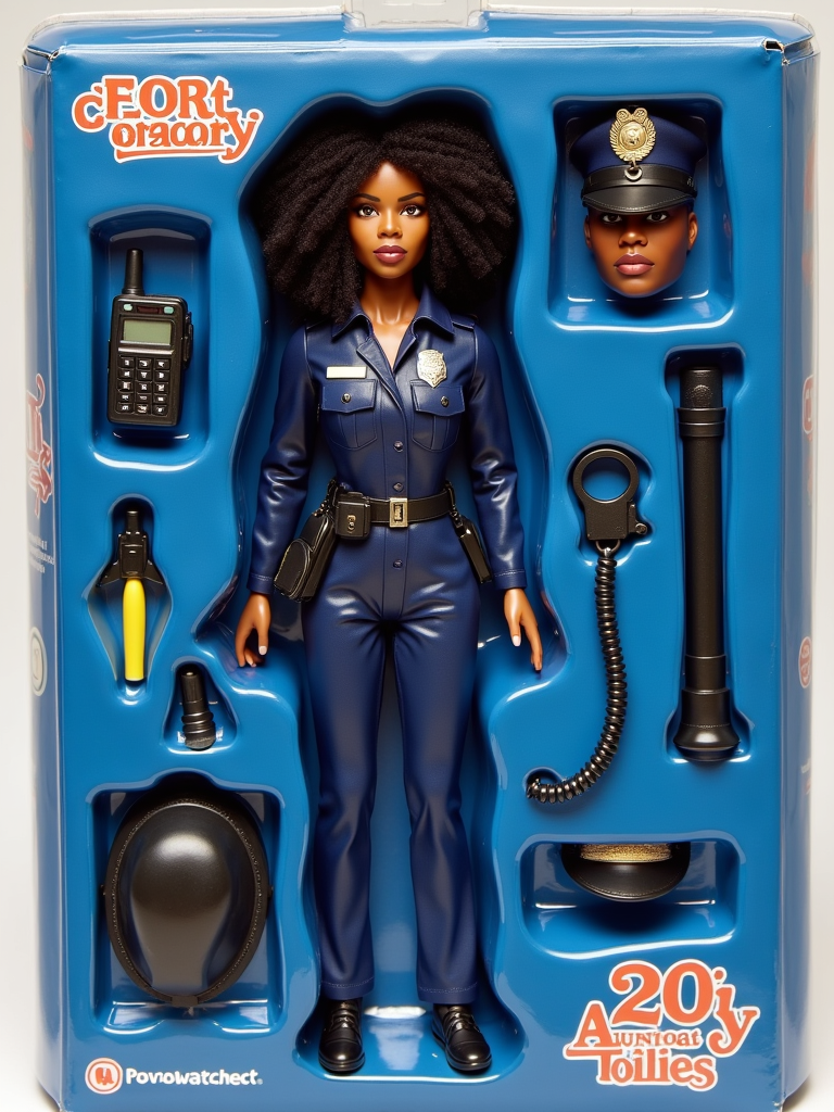 model as an action figure in packaging labeled 'POLICE EDITION'. Use model as a reference for the face. Model is 6 inches tall and dressed in police uniform with badge, and holding a walkie-talkie. The cardboard section should be blue. Include an 'Accessories' section with items like handcuffs, police hat, and flashlight. Make the design visually appealing and reflective of law enforcement profession. Do not include the character image on packaging.