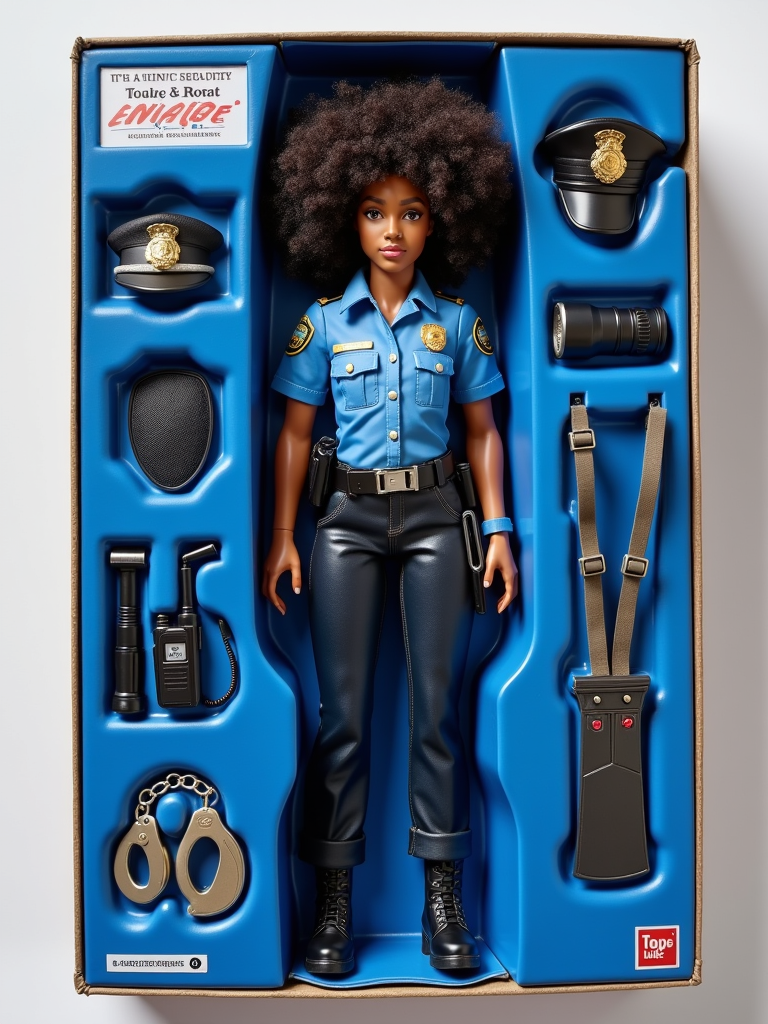 model as an action figure in packaging labeled 'POLICE EDITION'. Use model as a reference for the face. Model is 6 inches tall and dressed in police uniform with badge, and holding a walkie-talkie. The cardboard section should be blue. Include an 'Accessories' section with items like handcuffs, police hat, and flashlight. Make the design visually appealing and reflective of law enforcement profession. Do not include the character image on packaging.