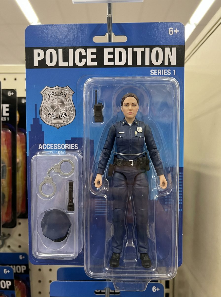 model as an action figure in packaging labeled 'POLICE EDITION'. Use model as a reference for the face. Model is 6 inches tall and dressed in police uniform with badge, and holding a walkie-talkie. The cardboard section should be blue. Include an 'Accessories' section with items like handcuffs, police hat, and flashlight. Make the design visually appealing and reflective of law enforcement profession. Do not include the character image on packaging.