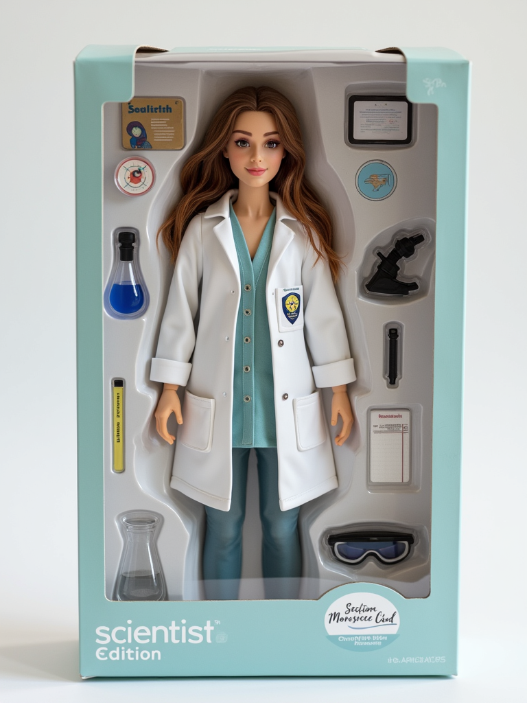 model as an action figure in packaging labeled 'SCIENTIST EDITION'. Use model as a reference for the face. Model is 6 inches tall and dressed in lab coat, and holding a test tube. The cardboard section should be white. Include an 'Accessories' section with items like microscope, safety goggles, and lab notebook. Make the design visually appealing and reflective of scientific research. Do not include the character image on packaging.