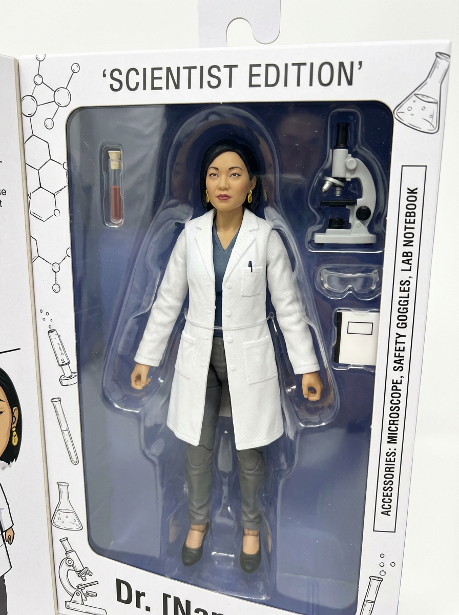 model as an action figure in packaging labeled 'SCIENTIST EDITION'. Use model as a reference for the face. Model is 6 inches tall and dressed in lab coat, and holding a test tube. The cardboard section should be white. Include an 'Accessories' section with items like microscope, safety goggles, and lab notebook. Make the design visually appealing and reflective of scientific research. Do not include the character image on packaging.