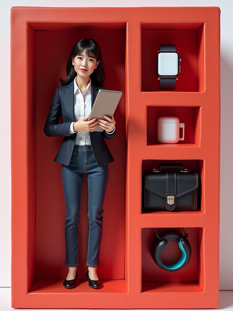 model as an action figure in packaging labeled 'STARTUP EDITION'. Use model as a reference for the face. Model is 7 inches tall and dressed in business casual attire, and holding a tablet. The cardboard section should be red. Include an 'Accessories' section with items like briefcase, smart watch, and wireless earbuds. Make the design visually appealing and reflective of a startup environment. Do not include the character image on packaging.