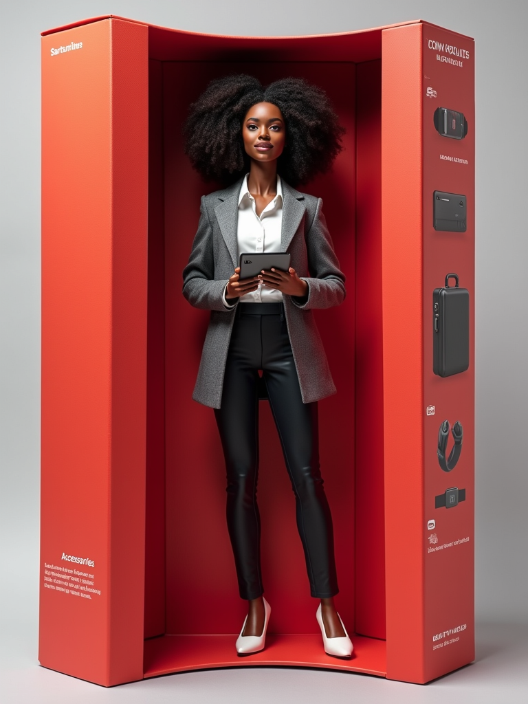 model as an action figure in packaging labeled 'STARTUP EDITION'. Use model as a reference for the face. Model is 7 inches tall and dressed in business casual attire, and holding a tablet. The cardboard section should be red. Include an 'Accessories' section with items like briefcase, smart watch, and wireless earbuds. Make the design visually appealing and reflective of a startup environment. Do not include the character image on packaging.