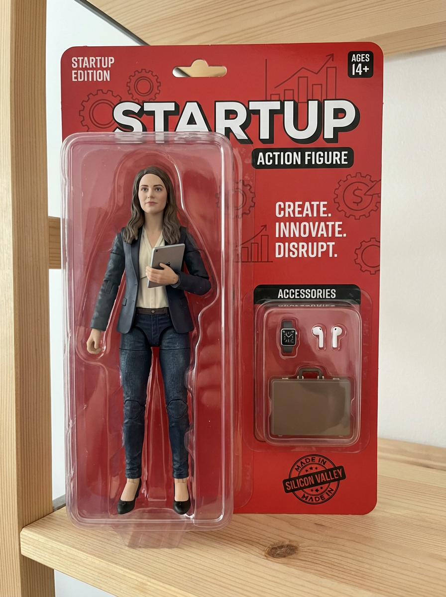 model as an action figure in packaging labeled 'STARTUP EDITION'. Use model as a reference for the face. Model is 7 inches tall and dressed in business casual attire, and holding a tablet. The cardboard section should be red. Include an 'Accessories' section with items like briefcase, smart watch, and wireless earbuds. Make the design visually appealing and reflective of a startup environment. Do not include the character image on packaging.