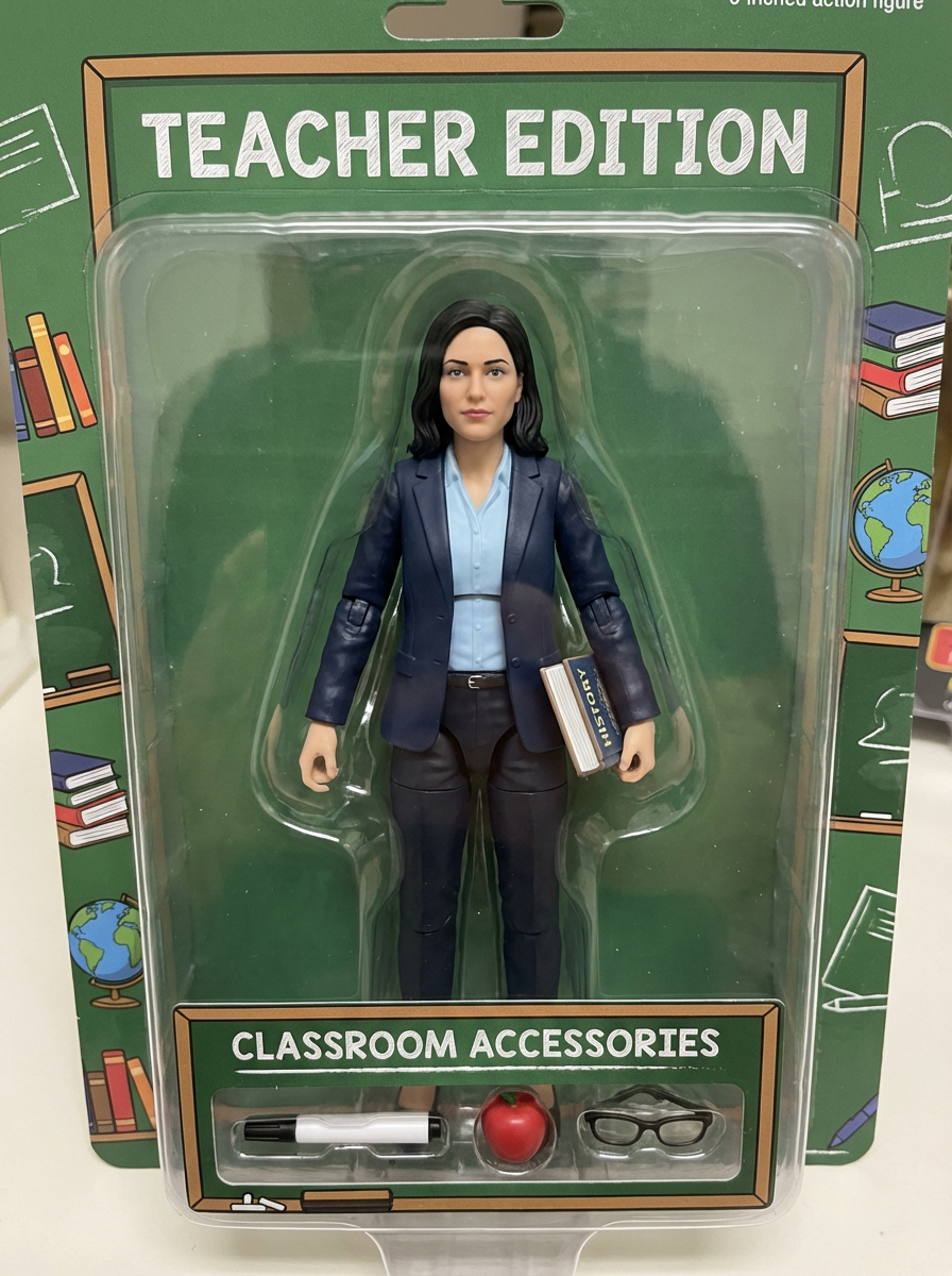 model as an action figure in packaging labeled 'TEACHER EDITION'. Use model as a reference for the face. Model is 6 inches tall and dressed in professional teaching attire, and holding a book. The cardboard section should be green. Include an 'Accessories' section with items like whiteboard marker, apple, and reading glasses. Make the design visually appealing and reflective of education profession. Do not include the character image on packaging.