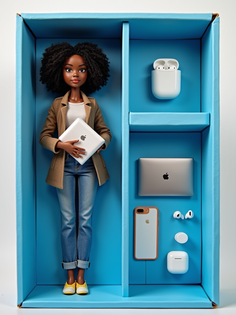 model as an action figure in packaging labeled 'TECH GURU'. Use model as a reference for the face. Model is 6 inches tall and dressed in tech attire, and holding a laptop. The cardboard section should be blue. Include an 'Accessories' section with items like smartphone, laptop, and wireless earbuds. Make the design visually appealing and reflective of tech industry. Do not include the character image on packaging.