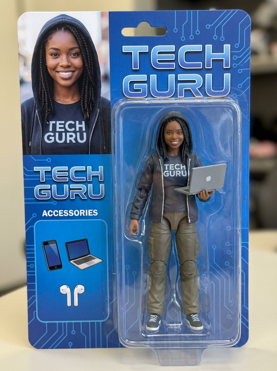 model as an action figure in packaging labeled 'TECH GURU'. Use model as a reference for the face. Model is 6 inches tall and dressed in tech attire, and holding a laptop. The cardboard section should be blue. Include an 'Accessories' section with items like smartphone, laptop, and wireless earbuds. Make the design visually appealing and reflective of tech industry. Do not include the character image on packaging.