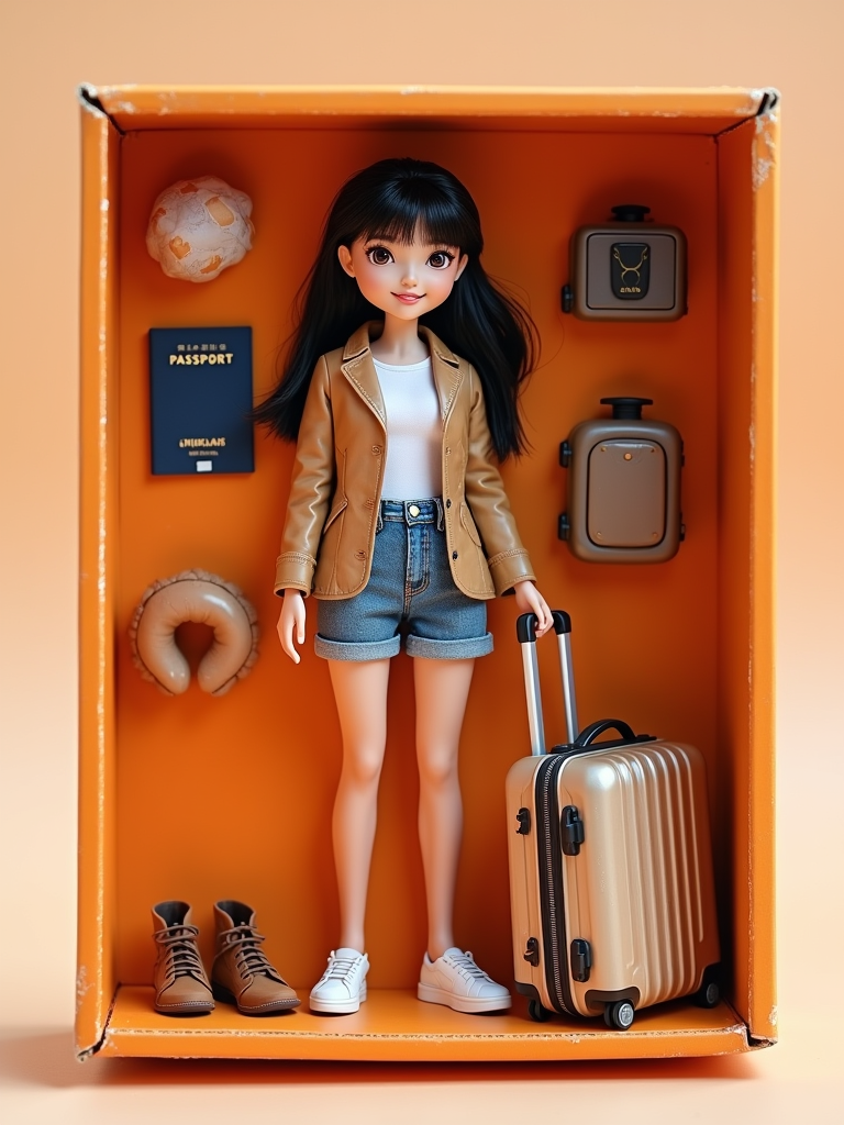 model as an action figure in packaging labeled 'TRAVELER\'S EDITION'. Use model as a reference for the face. Model is 6 inches tall and dressed in travel attire, and holding a suitcase. The cardboard section should be orange. Include an 'Accessories' section with items like passport, travel pillow, and travel bag. Make the design visually appealing and reflective of travel lifestyle. Do not include the character image on packaging.