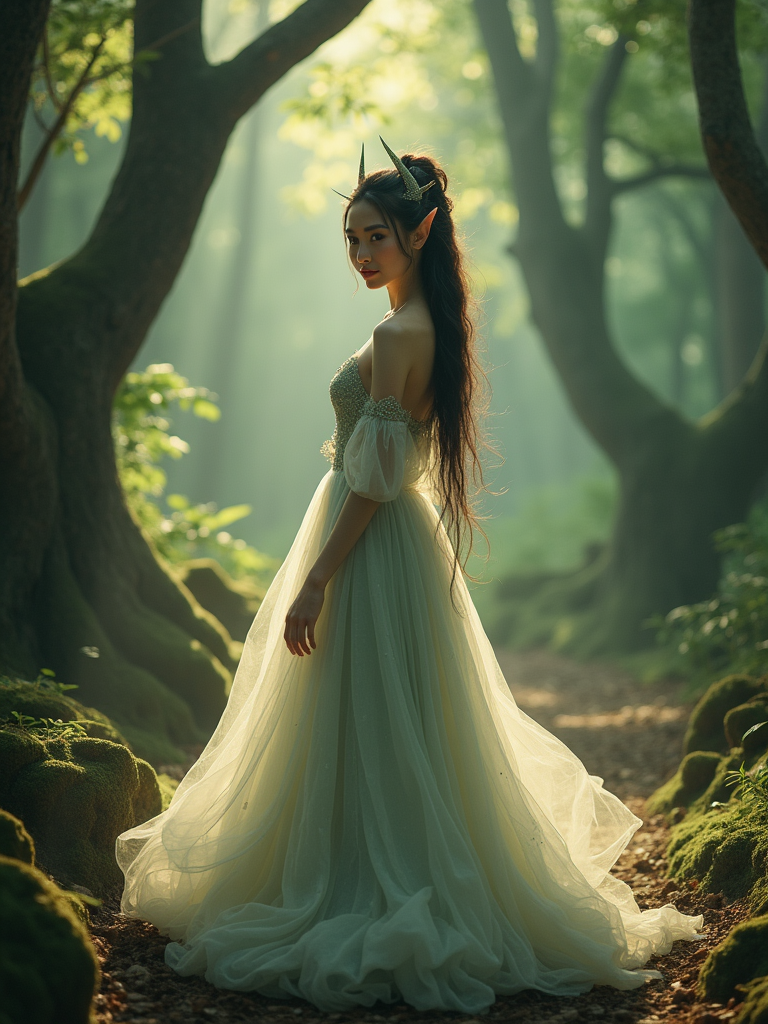 model as an elegant elf princess with pointed ears wearing a flowing ethereal gown in an enchanted forest with glowing magical light filtering through ancient trees