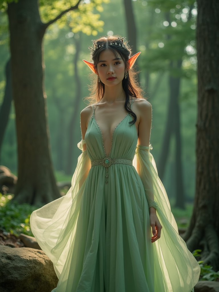 model as an elegant elf princess with pointed ears wearing a flowing ethereal gown in an enchanted forest with glowing magical light filtering through ancient trees