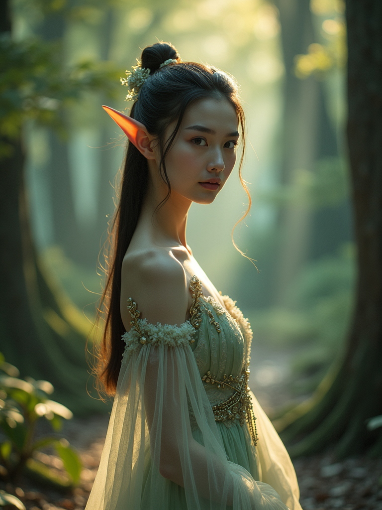 model as an elegant elf princess with pointed ears wearing a flowing ethereal gown in an enchanted forest with glowing magical light filtering through ancient trees